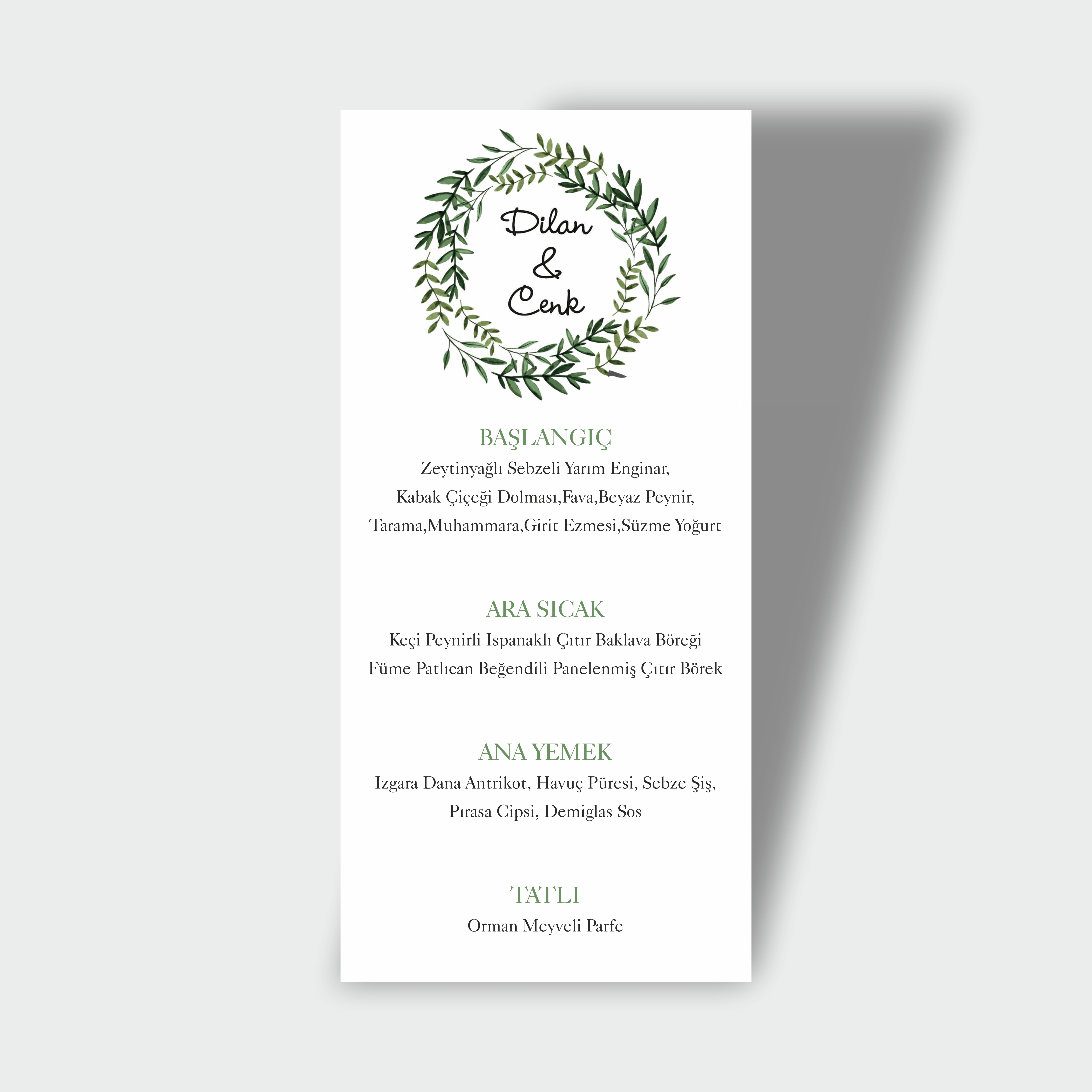 Menü Kartı, Yemekli düğün organizasyonlarınız için, davetiye ya da düğün konseptinize özel hazırlanmış 10×20 cm ebadında, 280 gr tuale kartona baskı.