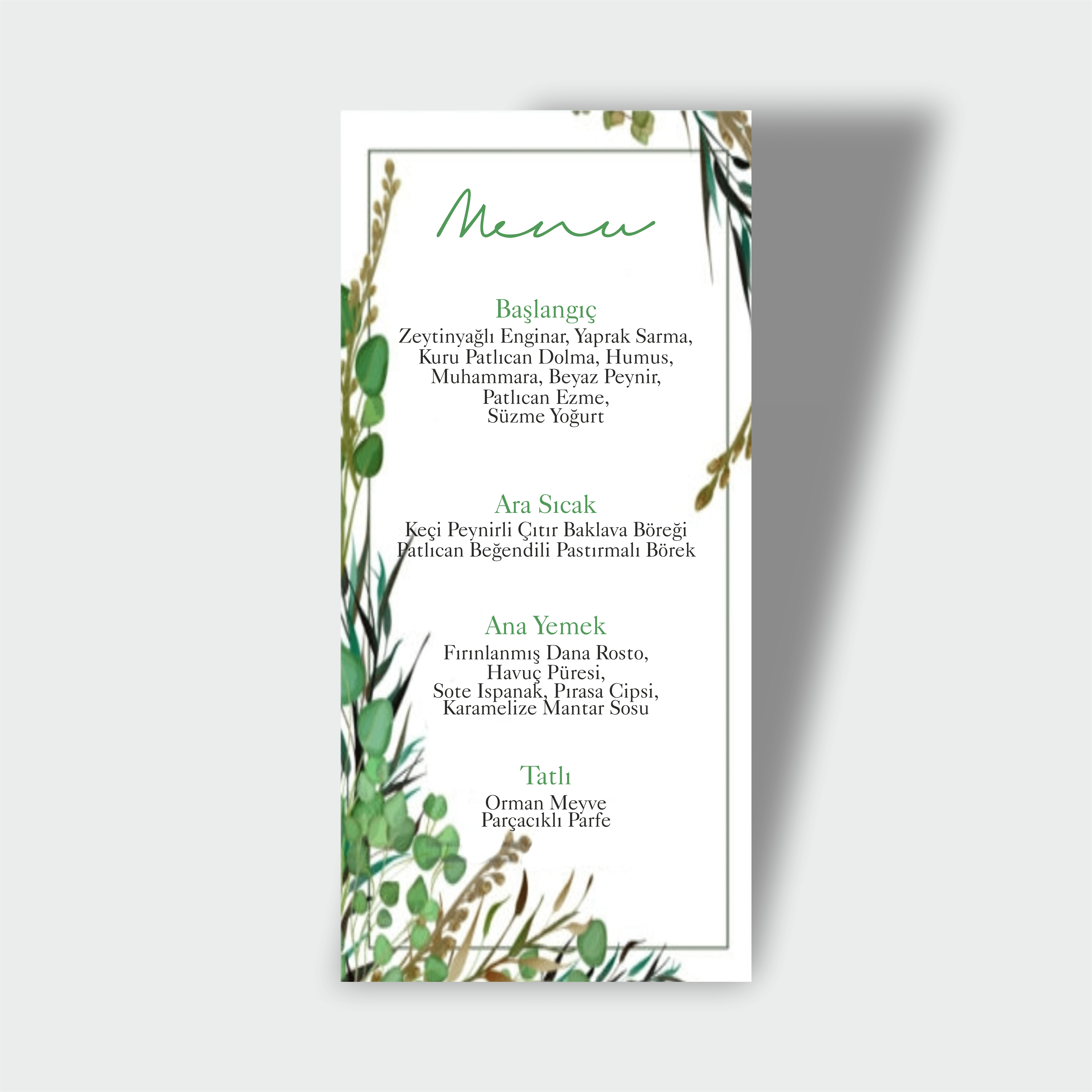 Menü Kartı, Yemekli düğün organizasyonlarınız için, davetiye ya da düğün konseptinize özel hazırlanmış 10×20 cm ebadında, 280 gr tuale kartona baskı.
